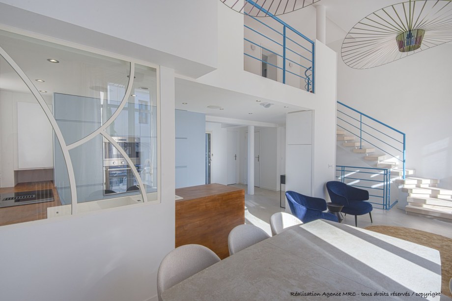 de la bibliothèque et de la cuisine sont supprimés pour permettre l’aménagement d’un volume agréable, fonctionnel et esthétique dans un esprit art déco