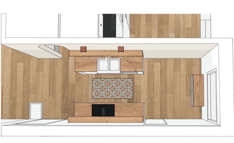 Dans la cuisine, le revêtement de sol retenu est un tapis de carreaux effet ciment, répondant aux
