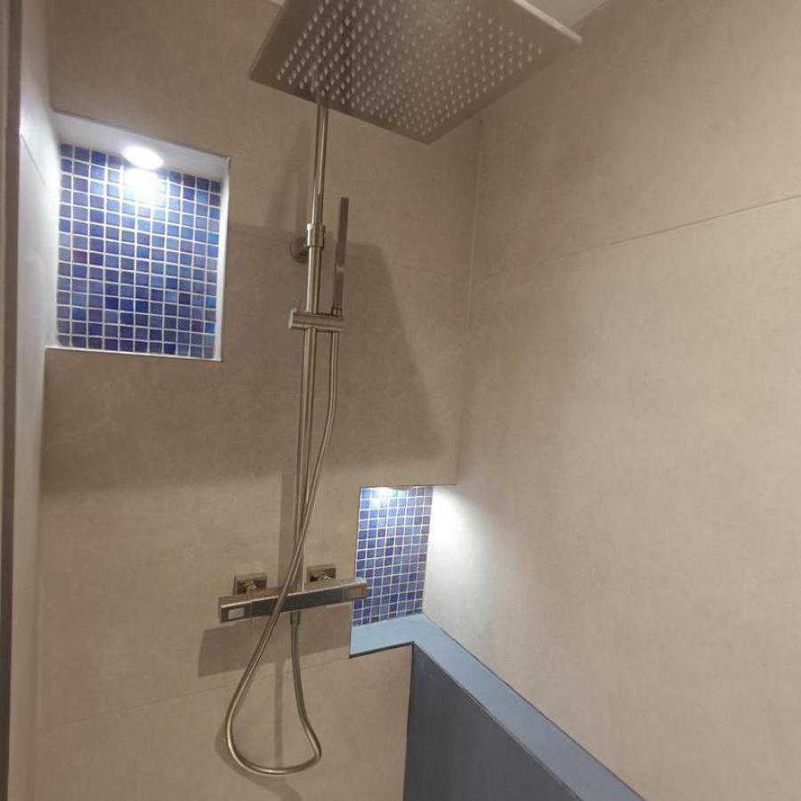 supporter un carrelage mural complet. L’ensemble des supports a donc été repris en plaques de plâtre hydrofuges afin d’assurer une base saine, durable et conforme aux normes. L’éclairage intégré des