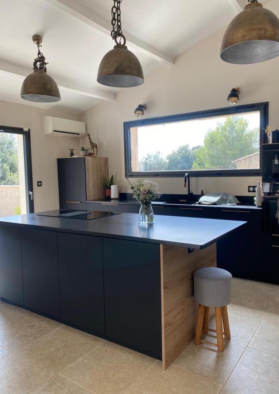 Lors de la phase de conception, deux scénarios esthétiques ont été étudiés : une version dans des tonalités vertes et une autre dans une palette plus foncée. C’est cette seconde option, plus affirmée et contemporaine, qui a été retenue. Ce contraste entre meubles noirs mats et travertin clair au sol crée une ambiance graphique et élégante, tout en conservant une touche provençale dans le choix des matériaux. Dans la première version, l’intégration de verrières intérieures avait également été envisagée pour renforcer la modernité et la circulation de la lumière.
