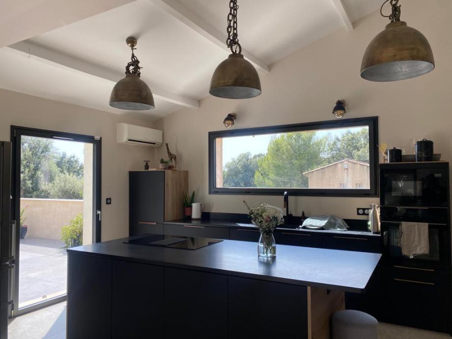 L’îlot central occupe une place stratégique : il regroupe la zone de cuisson, offre un vaste plan de travail et intègre un espace repas convivial, idéal pour la vie quotidienne et la réception. Les doublages et les peintures ont été entièrement repris pour un rendu net et lumineux, tandis que le sol en travertin unifie la cuisine avec les autres pièces de la maison. Enfin, la hauteur sous plafond est sublimée par de grandes suspensions métalliques à chaînes, apportant du caractère et une atmosphère chaleureuse.