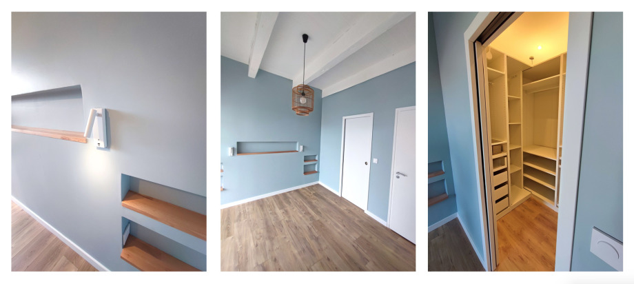 La tête de lit devient un élément d’agencement à part entière. Nous intégrons des niches et tablettes, ainsi que l’éclairage, les prises et tous les détails de raccord pour une finition nette et durable.