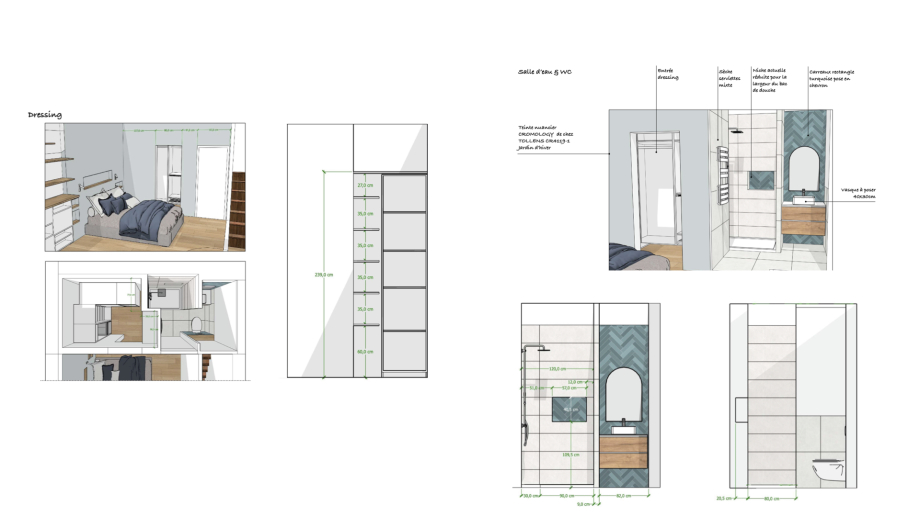 Optimisation de l’espace d’une suite parentale : dressing, tête de lit et salle d’eau, avec élévations et coupes techniques pour les artisans