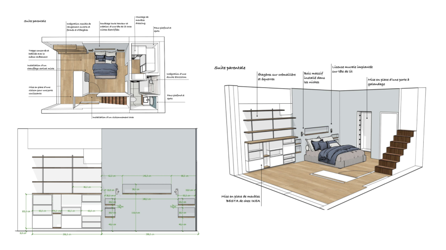 Conception de l’avant-projet d’une suite parentale sur mesure dans une maison : espace nuit, salle d’eau et bureau